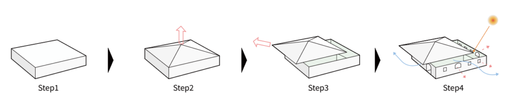 外壁で360度を囲い、その上に同寸の方形屋根をずらして架けることで、半屋外、軒下、屋内の3層的な空間を生み出す住宅である。主庭や菜園、駐車場などを内包し、内外が対等につながる構成とした。中央の耐震コアを軸に回廊状に諸室を配置し、大開口で庭と一体化。統一素材の外観が静かな存在感を与える。