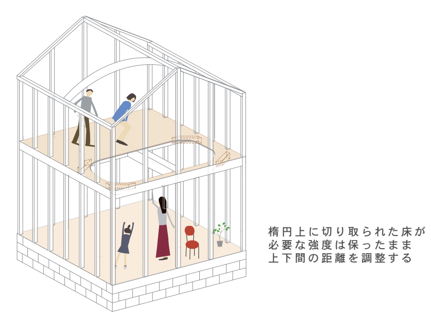 島根県邑南町の棚田と山林に囲まれた敷地に建つ、築約80年の土蔵をゲストルームへ改修した計画である。最小限の設備と工事で蔵の力強さを活かし、2階床を円形にくり抜いて吹抜けを設け、上下階を緩やかにつないだ。低い天井による圧迫感を解消し、梁や架構を感じる特別な空間を実現。構造補強も施し、安全性も確保している。