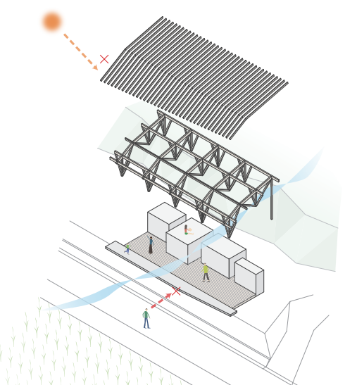 中山間地域・邑南町の自然豊かな敷地に建つ、4人家族のための住宅である。農道や崩れ石積への配慮から東西に細長い構成とし、プライバシー性の高い箱の上に大屋根を架け、自然と一体となる暮らしを実現した。キャンチレバーのテラスと格子が視線を遮り、通風・採光・積雪対策にも対応。方杖は空間を柔らかく仕切り、家族が程よくつながる住環境をつくっている。