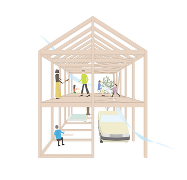 駅近の混在市街地に建つ、間口約6mの狭小木造住宅である。敷地を東西に二分し、屋内と半屋外のバッファーゾーンを設けることで、通りと住まいを緩やかにつないだ。上下に庭とテラスを配し、光や風を取り込む立体的な住空間を実現。格子床と屋根で日射と視線を調整し、将来の増築にも対応する柔軟な住まいとしている。